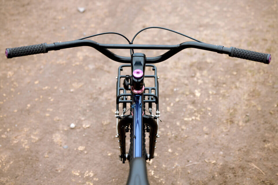 BMX からインスピレーションを得たデザインを提供しますが、さらにライズ、バックスイープ、アップスイープを強化しています。